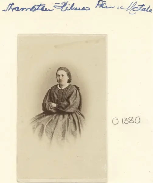 Enligt påskrift porträtt av fröken Hilma Thamsten, Motala. Tolkat föreställa Hilma Sofia Ottilia, född 1839 i västgötska Mölltorp. Dotter till handlaren och bagaren Carl Thamsten och makan Johanna Gustava Bergvall. Föräldrarna var bördiga från Motala respektive Skeppsås men hade som gifta i Motala flyttat till Mölltorp strax före Hilmas nedkomst. År 1844 inflyttade familjen till emellertid Vadstena men redan året därpå avled fadern. De kvarvarande i familjen kunde emellertid bo kvar i stadsgården som ägdes av släktingar. Det var för övrigt inte första gången Hilmas mor blev änka. Redan år 1831 hade äktenskapet med bokhållaren vid Göta kanalverken, A. F. Leffler, upphört efter att denne, som källorna anger, "långsamt och tärande" gått bort i lung- och leversot. Hilma blev tillsammans med modern kvarboende i släktgården en lång tid, ända till år 1870. I november månad sagda år flyttar de av okända skäl till Motala. Efter knappa 15 år avled modern efter ett långt liv år 1883. Hilma blev kvar i Motala och vi finner henne på en rad adresser till sin egen död i bukhinneinflammation den 15 oktober 1907. Hon förblev ogift livet genom.