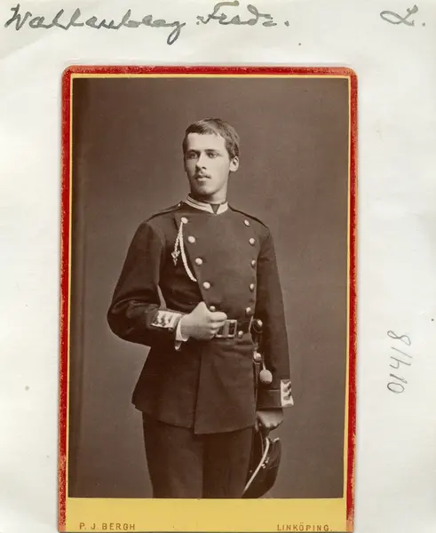 - Ungdomsporträtt av Fredrik Wallenberg. Född i Stockholm men uppvuxen i Linköping där fadern, som tidigare varit huvudstadens polismästare, valt en lugnare tjänst som landssekreterare. Fredrik Wallenberg inledde en militär karriär som volontär vid Andra livgrenadjärregementet i Linköping 1882 och vid Första livgrenadjärregementet i samma stad 1883. Efter militär utbildning vid Krigsskolan återkom han till det sistnämnda regementet 1886 och erhöll underlöjtnants grad. Hans håg stod emellertid för konsten och det skrivna ordet, varför han begärde avsked 1892. Istället kom han att försörja sig som tecknare och medarbetare i tidningar. Som sådan var han exempelvis anställd i Paris under åren 1895 till 1901 och i London under perioden 1901-1922. Hans arbete medförda omfattande resor i skilda världsdelar. I sitt privata liv var han från år 1900 gift med Helen Elisabet Mac Horton. Som änkling gifte han om sig 1926 med Ingeborg Emma Gustava Wallenberg.