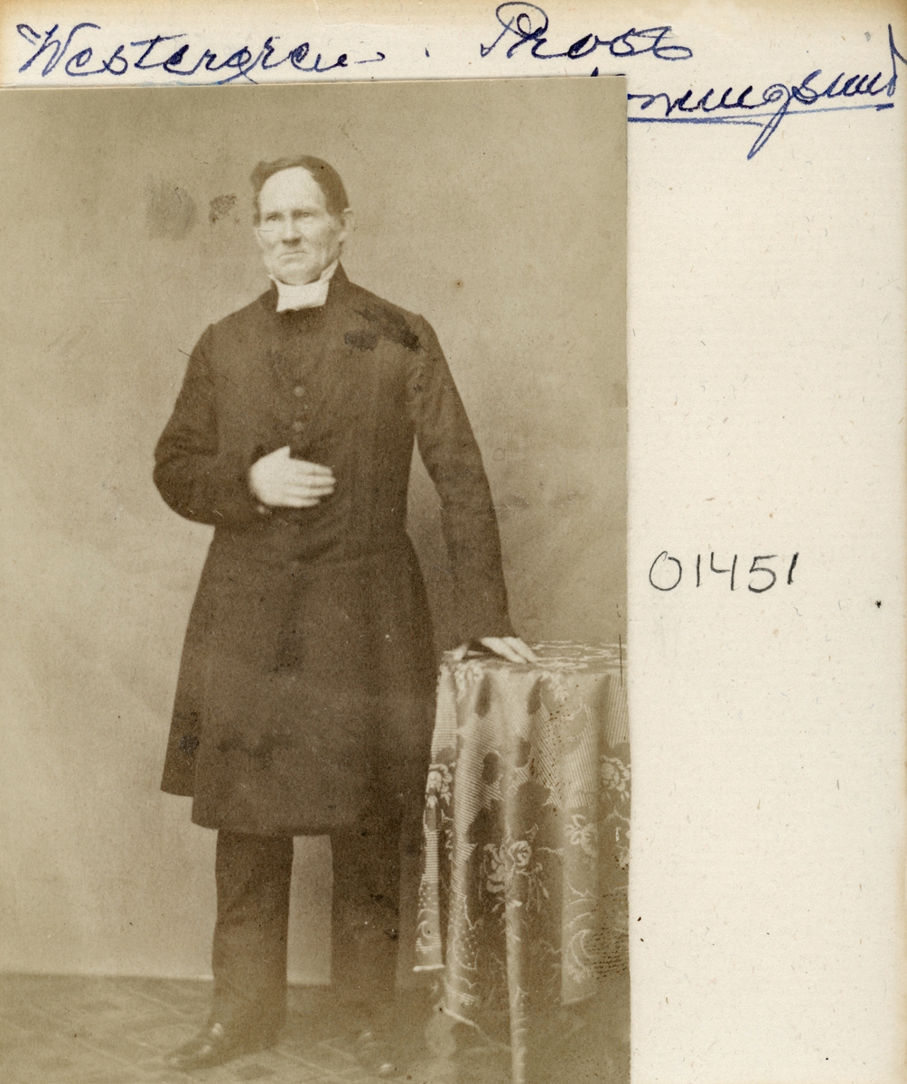 Enligt påskrift porträtt av prosten Westergren i Konungsund. Fotografiet är vanskligt att datera och jämförbara porträtt saknas. Icke förty torde bilden föreställa Magnus Westergren. Född i Kuddby 1803 återvände han efter studier i Uppsala till hemorten för en tjänst som församlingens adjunkt. Året var då 1829 och här blev han kvar till 1833 då han bröt upp för samma tjänst i Klockrike. Efter någr...