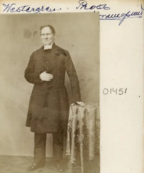 - Enligt påskrift porträtt av prosten Westergren i Konungsund. Fotografiet är vanskligt att datera och jämförbara porträtt saknas. Icke förty torde bilden föreställa Magnus Westergren. Född i Kuddby 1803 återvände han efter studier i Uppsala till hemorten för en tjänst som församlingens adjunkt. Året var då 1829 och här blev han kvar till 1833 då han bröt upp för samma tjänst i Klockrike. Efter några år i församlingen erbjöds han posten som vice pastor i Konungsund på Vikbolandet. Han inflyttade sommaren 1839 och blev under sin första period i socknen kvar till 1847. Mellan sistnämnda år och våren 1850 bistod han som pastorsadjunkt domprost Lars Laurenius i Linköping och var bosatt i dennes domprostgård. I maj månad 1850 ingick han äktenskap med Eva Fredrika Rundeberg och de nygifta flyttade till Styrstad där Magnus erbjudits tjänsten som komminister. Som varande en kyrkans man utan egen församling att leda fick Westergren likt sina ämbetsbröder inte sällan vänja sig vid ständiga flyttar i sökandet efter en stadigvarande tjänst eller avancemang. Därutav blev Ledberg nästa hemvist för makarna, där församlingen stod utan komminister sedan frånträdande Jacob Öster lockats till Östra Harg. Våren 1863 var de emellertid tillbaka i Konungsund. Socknens kyrkoherde Juringius hade dött, nu behövde vakansen tillsättas och Domkapitlet utsåg den redan beprövade Westergren. Hans tid som församlingens kyrkliga ledare blev lång, från nyss nämnda 1863 till sin död 1886. Hans barnlösa äktenskap hade dess för innan nått sin ände vid makans bortgång 1877.