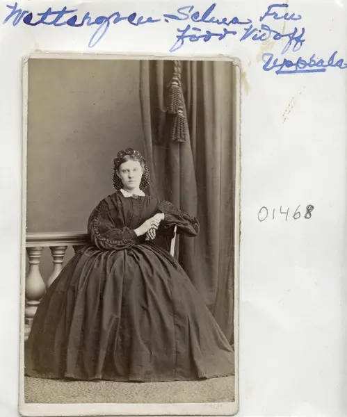 Selma Widoff i linköpingsfotografen Svante Leonard Rydholm ateljé något av 1860-talets första år. Född 1842 i Kaga och där boende i Sättuna, är hon således runt 20 år på bilden och har livet framför sig. Likafullt har hon upplevt prövningar. Ännu inte fyllda 4 år hade hennes mor dött i vattensot, ett av tidens många gissel. Fadern hade vidare gift om sig med en äldre syster till sin första fru, men även hon dog inom kort i en annan av tidens plågoris, lungsoten. Fadern kom att gifta sig en tredje gång och vi är då närmast framme vid tiden för bilden. Det tredje äktenskapet varade till faderns död maj månad 1870. Selma var då ännu skriven i Kaga men uppges vistas i Herrberga, där en äldre bror ägde och drev Forsa södergård. I Herrberga, eller annorstädes, träffade Selma under alla omständigheter sin blivande make i Carl Anders Emil Wettergren, som arbetade som inspektor i bruksorten Svabensverk i sydvästra Hälsingland. Där satte de bo och i november månad 1880 fick de sonen Karl Axel August, som kom att bli makarnas enda barn. Efter knappa 10 år bröt de upp från Hälsingland för att flytta till Linköping, där de bosatte sig i en våning på adressen Drottninggatan 22. Efter nya tio år lämnade makarna Linköping för ny tillvaro i Uppsala, som kom att bli deras sista gemensamma hem. Maken avled i Uppsala 1906 och någon gång därefter flyttade Selma som änka till Stockholm. Hon fick ett långt liv. Hon somnade in dagar före sin 93-årsdag. Hon var då skriven på Kommendörsgatan.