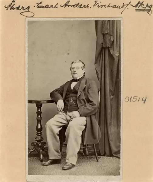 Porträtt av vem som tolkas vara vinhandlaren och källarmästaren Carl Anders Åberg. Född i Norrköping 1822 och där uppvuxen i en krögarfamilj kom han till Linköping år 1840 för tjänst som kypare vid broderns utskänkningsställe invid Storgatan nära Stora torget. I mars månad 1847 bröt han upp för ny roll som egen källarmästare i Örebro. Där blev han kvar till 1856 för att nämnda år återvända till Linköping. Skälet var att brodern dött och det torde bestämts att Carl Anders skulle ta över etablissemanget. Så skedde och därefter följde enligt källorna en räcka år med till synes stabil verksamhet. Även källarmästarens privata liv verkar ytligt sett stabilt, ensam som han bodde i sin våning över restaurangen. Men hösten 1861 hade en piga som tjänade hos källarmästare Gustaf Sjöberg blivit med barn. Hon hette Ida Wilander och i juni månad följande år nedkom hon med en oäkta dotter, som även hon fick namnet Ida. Efter att ha bott på ett otal adresser inom loppet av några år blev hon under 1870 piga hos Carl Anders. Deras mellanhavanden utvecklades och sensommaren 1872 sammanvigdes de. Om inte förr, skulle man kunna säga, emedan Carl Anders i sammanhanget erkände faderskapet till hustrun Idas dotter Ida. Den lilla familjen fick knappa tio år tillsammans innan den åldrige källarmästaren avled i sviterna av lunginflammation.