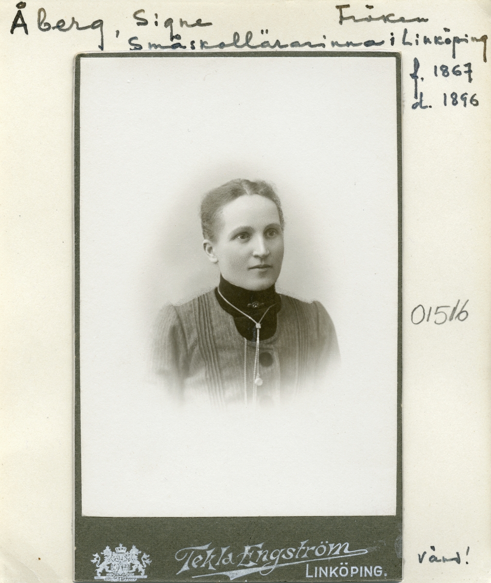 Porträtt av Signe Åberg. Född i Flistad 1867 som dotter till Carl Ludvig Åberg och hustrun Laurentia Charlotta Bergman. Fadern var upplysningsvis yngre bror till den välkända arkitekten och konstnären Henrik Åberg (1841-1922). Signes far fick dock ett kortare liv. Han avled i sviterna av maginflammation, nyss fyllda 30. Änkan och barnen flyttade därefter till släktingar i Ekkällan söder om Linköping men något senare till egen bostad i själva staden. Från 1880-talets mitt verkade Signe som lärare vid Linköpings så kallade småskolor. Som kvinnlig lärare förblev hon som tiden påbjöd ogift livet genom. Under år 1905 lämnade hon dock sin plats i moderns hushåll och flyttade till eget boende invid Drottninggatans östra ände. Tiden där blev emellertid kort. Hon avled redan i februari månad 1906.