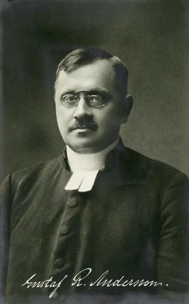 - Porträtt av Gustaf R Andersson. Om initialbokstaven ska knytas till hans första eller andra mellannamn, Rudolf och Raginius, skall här inte närmare ordas om utan endast noteras då han tycks använt det för egen del. Under alla omständigheter föddes han i Linköping 1865 som son till pumpborraren Johan Andersson och dennes hustru Johanna Samuelsdotter. Uppväxten var till synes inte helt problemfri. Både fadern och en äldre bror blev under Gustafs barndom dömda för brott, misshandel respektive stöld. Fadern varnades även, för vad tiden angav, äktenskapsoenighet. Kanske påverkad av besvärligheter i barndomen, kom Gustaf att skriva in sig vid Uppsala universitet för teologiska studier. Efter studenten år 1885 påbörjade han, som inte sällan var nödtvunget för nyuteximinerade teologer, en rörlig tillvaro med kyrkliga tjänster i bland andra Risinge, Östra Eneby, Tjällmo och småländska Hult. Under året 1911 blev han erbjuden tjänsten som domkyrkokomminister i Linköping, och därefter kom hans tillvaro te sig mer stadig. Från 1902 var han gift med Elsa Törnblom, bördig från Eksjö.
