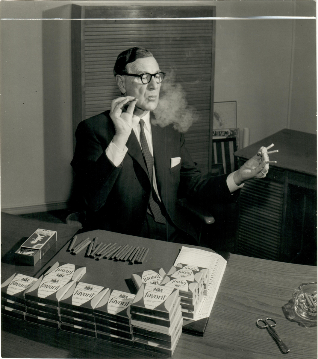 En man röker cigarrer av märket Favorit, till vänster ligger en tändsticksask från Soltstickan.