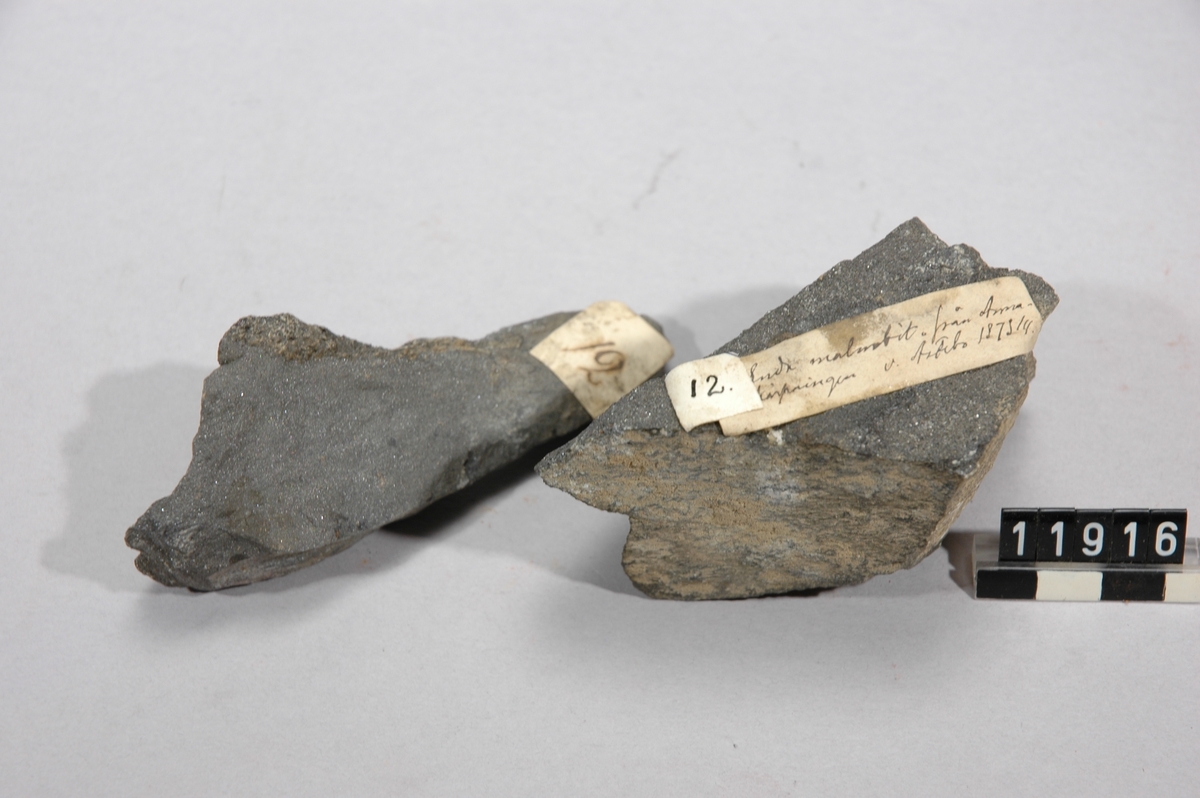 Tillhör en samling mineral m.m. Jernmalm från Anna Skärpningen, Åstebo ur Brukspatron Gustaf Benedicks mineralsamling och Bituminös Jernmalm ur Dannemora samlingen.