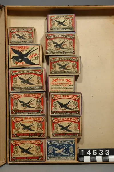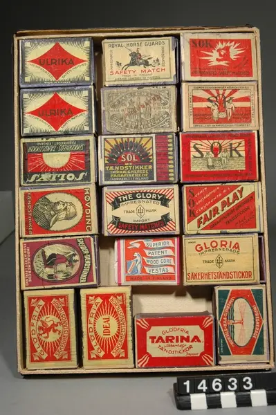 • Grupperingspost för en samling tändsticksaskar, varav många med stickor bevarade, tillverkade i Sverige och de flesta andra tändsticksproducerande länder. Samlingen består av 116 lådor i vilka tändsticksaskarna är sorterade efter olika rubriker exempelvis länder. Nedan följer en lista på de 116 lådorna och de rubriker som står utanpå dessa. Fotografierna har samma nummer som respektive låda. Samm... Visa hela