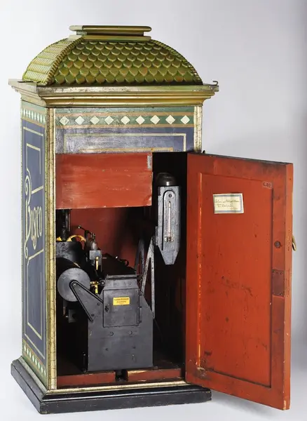 Fotoautomat "Bosco" för tillverkning av ferrotypier. Penningautomat för självfotografering. Den fungerade på så sätt att det ljuskänsliga skiktet placerats i en profilerad plåtbricka som på samma gån...