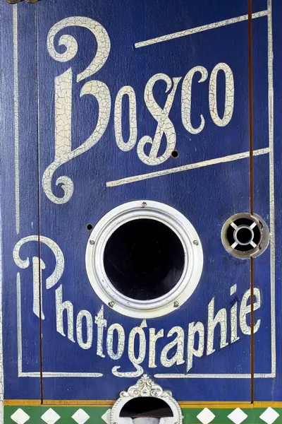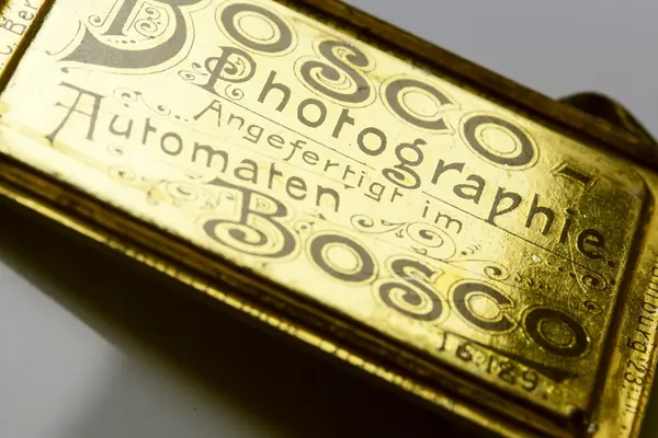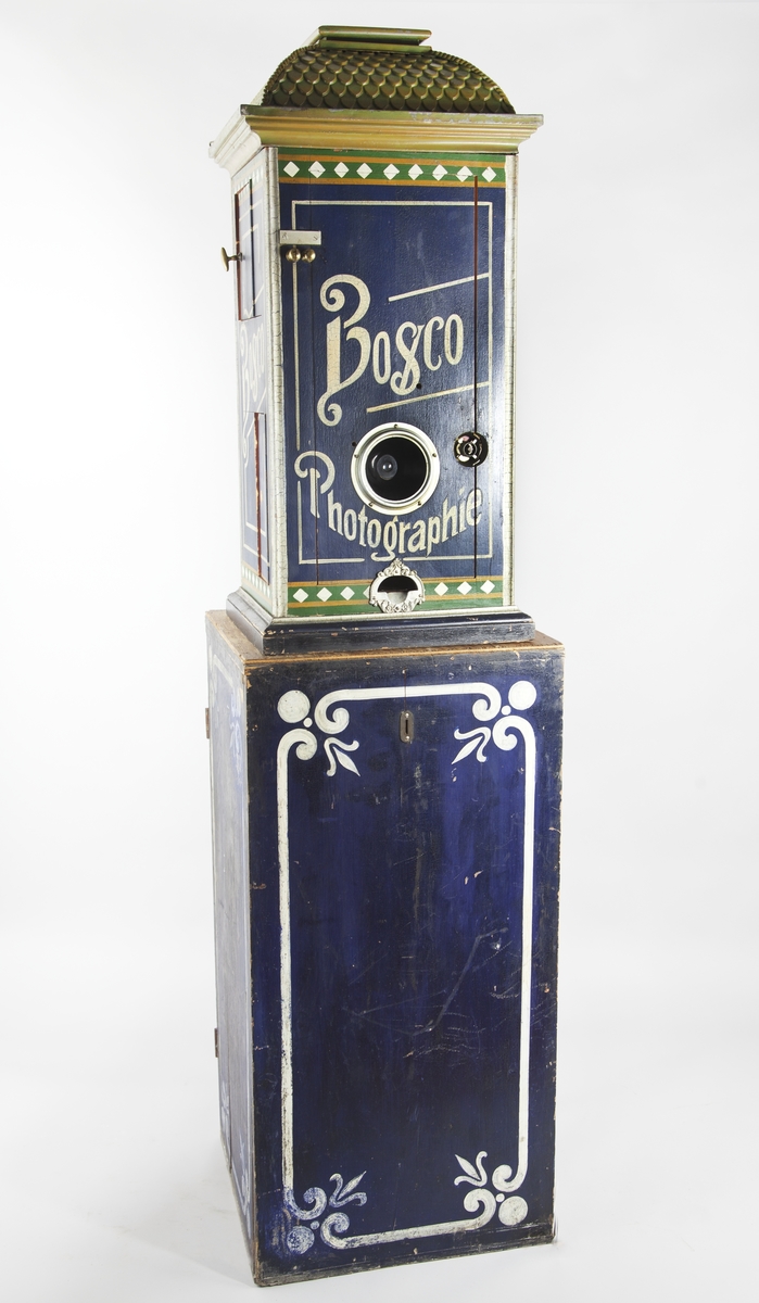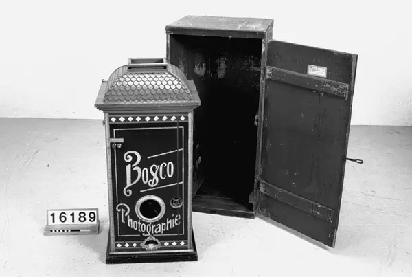 Fotoautomat "Bosco" för tillverkning av ferrotypier. Penningautomat för självfotografering. Den fungerade på så sätt att det ljuskänsliga skiktet placerats i en profilerad plåtbricka som på samma gång var framkallningsskål och sedan ram för fotografiet. I automaten exponerades bilden i lodrätt läge och framkallades sedan med vätskor som portionerades ur behållare. Efter tre minuter var ferrotypen klar och matades ut ur apparaten. Den behövde torka ytterligare och fick enligt anvisningarna inte utsättas för starkt ljus förrän den var torr. Bilden mätte 60x83 mm och levererades i ett etui av papper. Plåtbrickan hade påtryck av reklam och information på baksida och kanter. Tillbehör: Sockel med 2 st. metallådor för plåtar, 10 st. plåtar ("W.H.C Bernitt Original Bosco Platte Hamburg 23 ...), överdel med kamera, mekanism, mekanism för framkallning m.m. nyckel till verket.