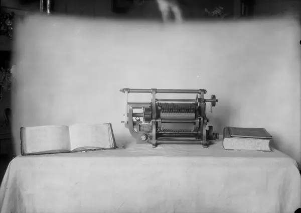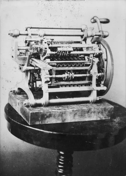 Differensmaskin avsedd för automatisk beräkning och tryckning av matematiska tabeller (logaritmtabeller, potenstabeller, kvadrat- och kubikrötter). Tillbehör: Låda till förvaring.