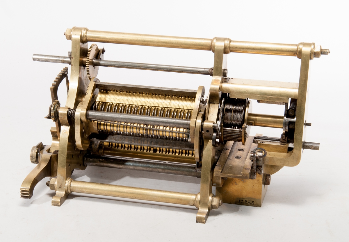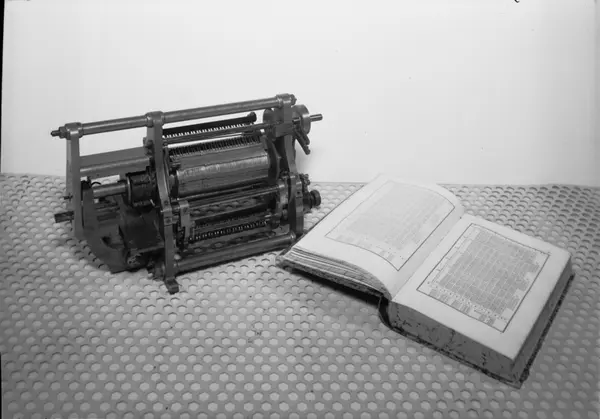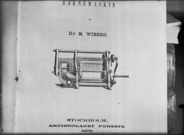 Martin Wiberg konstruerade denna räknemaskin, som är till för att räkna ut och trycka logaritmtabeller. Tabellerna var viktiga i all verksamhet där man gjorde manuella beräkningar och kunde hämta tidigare beräknade värden till dessa. Uppfinningen går tillbaka på Charles Babbage "the Difference Engine", förslag till en beräkningsmaskin som han presenterat 1821. Den kom inte till stånd men principerna användes av Georg Scheutz i Sverige som kunde göra en prototyp för att trycka tabeller. Wiberg i sin tur brevväxlade med Babbage om konstruktionen av denna maskin, som var klar 1875. Fotot på en bok visar ett exemplar av en logaritmtabell med Wibergs dedikation till John Ericsson. Boken inköptes till museet år 1945 .