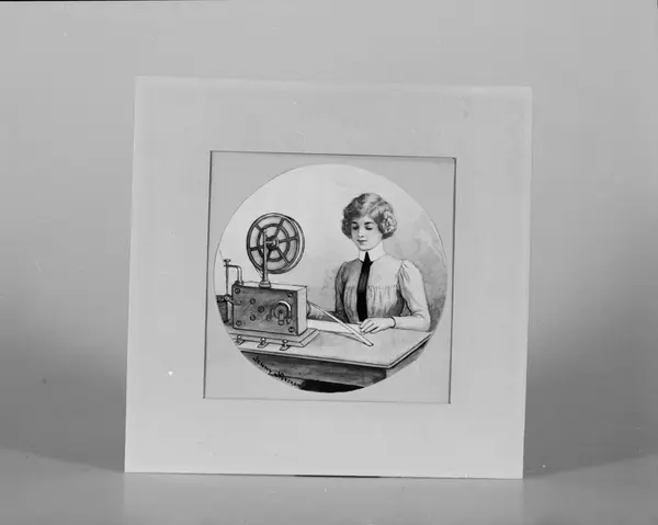 • Förlaga till vykort, kvinnlig telegrafist vid morsetelegraf av L.M. Ericssons modell. I ram under glas. Ramen från 1950-talet skadad.