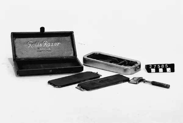 Rakapparat med stycke av skålslipat rakknivsblad i ram av förgylld mässing med slipoch strigling, i etui, jämte bruksanvisning m.m. Tillbehör: Låda.