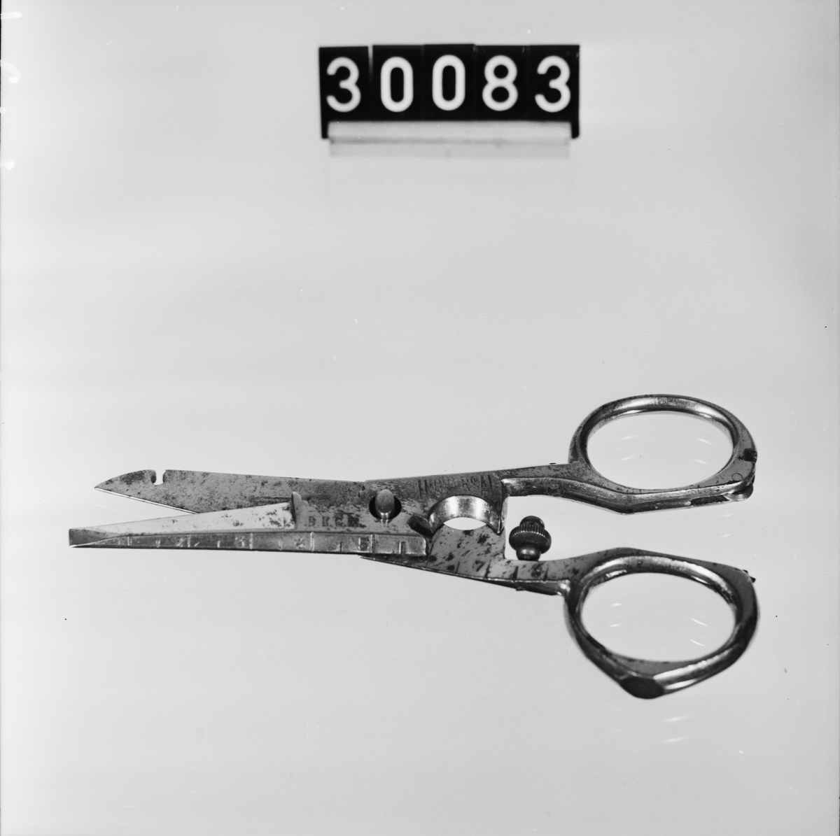 Ficksax, universalverktyg, av förnicklad stål. Med följande funktioner: Perforeringskugge. Ställskruv för knapphålsklippning. Glasskärare. Glasavbrytare för 2 mm glas. Trådpåträdare. Nagelfil. Cigarrsnoppare. Skruvmejsel. Graderat cm-mått. Hammare. Glaslins med sv.vit foto av landskap. Järntrådsböjare. Ljusveksnoppare.