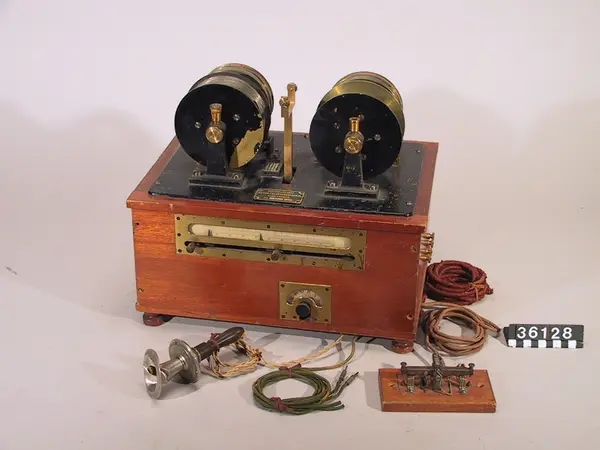Telegrafon, enligt konstruktion av Valdemar Poulsen och O.P. Pedersen. Registrerar magnetiskt på tråd, hastighet 2 m#s. Ström 110 V. In- och avspelning i bägge riktningarna. Mikrofon och anslutningssladd medföljer.