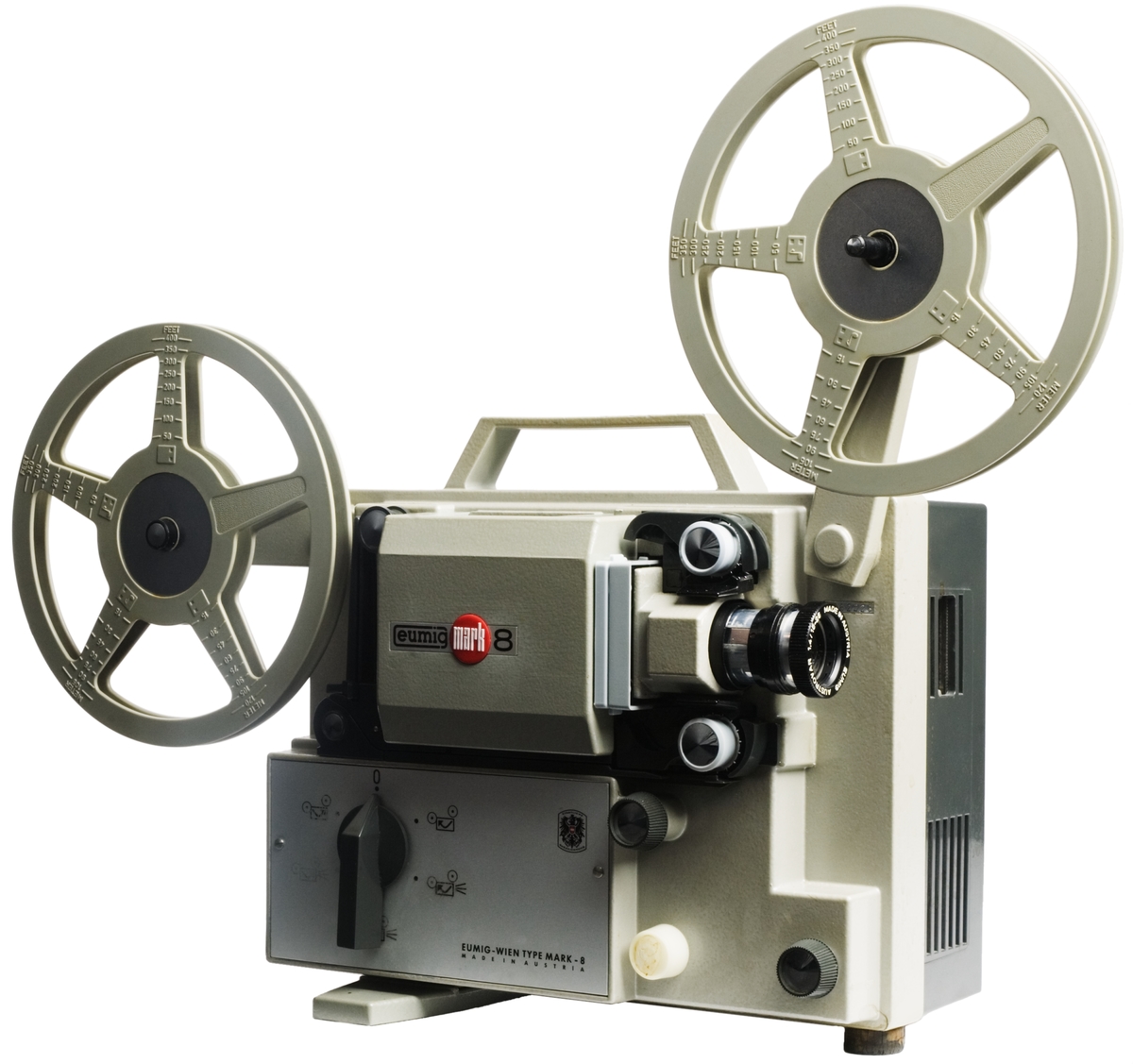Smalfilmsprojektor Eumig Mark 8. Stumprojektor variabel för 8 mm standard- super 8- och single 8-format. Grått plasthölje med handtag, anslutningskabel med stickpropp. Ett filmhjul. Zoom-objektiv Austrovar 1.4/15-25 mm. Två satser matningsdetaljer, ljusgrå resp. mörkgrå. När de ljusgrå är insatta i projektorn skall i locket finnas: 2 mörkgrå filmmatningshjul där till filmtryckplatta och filmbana samt en vit hylsa. Hopfälld, längd: 280 mm, bredd: 150 m, höjd: 250 mm.