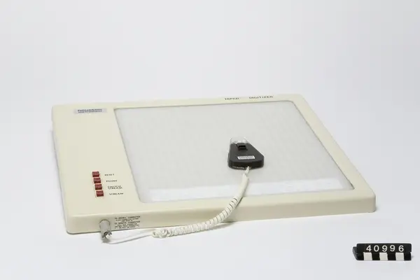 Pekdon för dator. Tillverkad av grå plast. Skiva av vit halvtransparent plast, indelad i ett rutnät. Styrdon (puck) av svart plast med hårkors, ansluten till bordet med en spiralsladd. Fyra knappar på ovansidan: RESET, POINT, SWITCH STREAM och STREAM. 25-polig D-sub och 3,5 mm phonojack i bakkant.