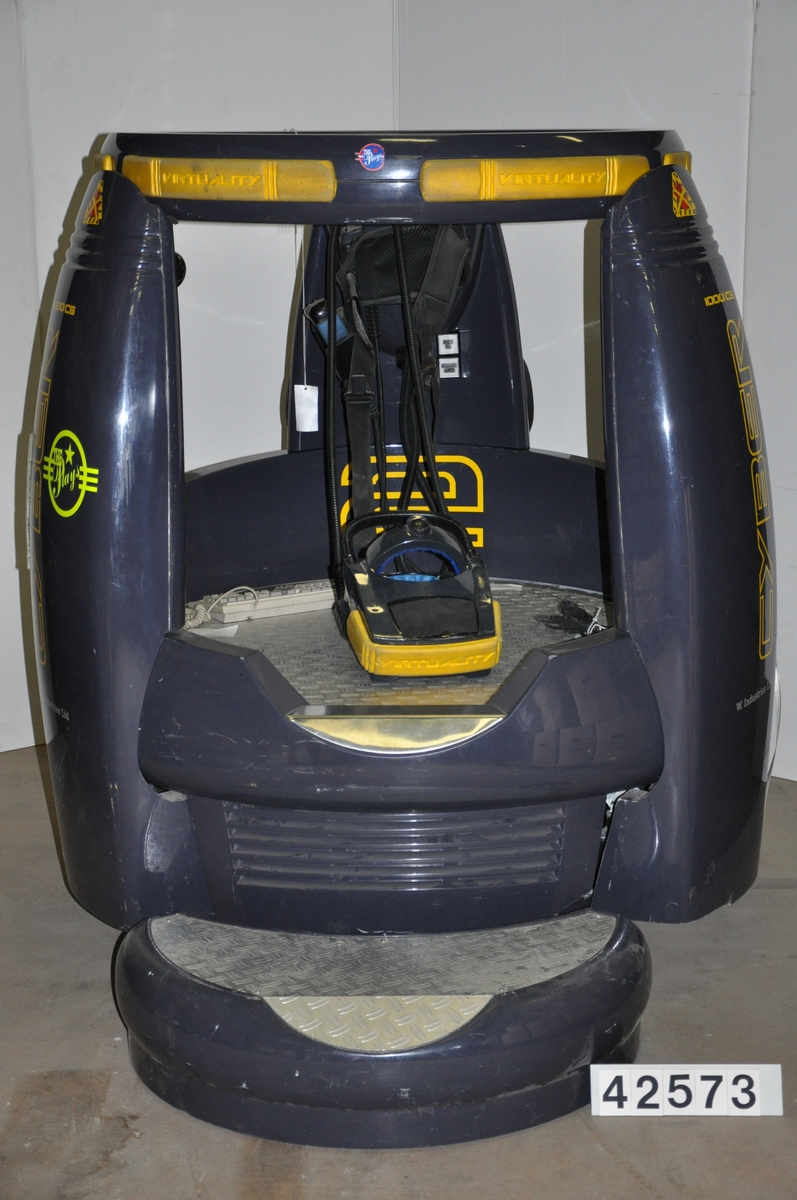 Cyber 1000CS, bestående av en huvudenhet monterad på bottenplatta. VR-hjälm, Styrenhet Expality 2000. Styrdator Commodore Amiga A3000. Två sidopaneler varav en med ett handtag. Båda märkta: "Model CS 1000". Tillbehör: Lös lucka märkt model CS1000. Plastöverdrag märkt med "W Industries Ltd", blått. Elsladd 220 V.