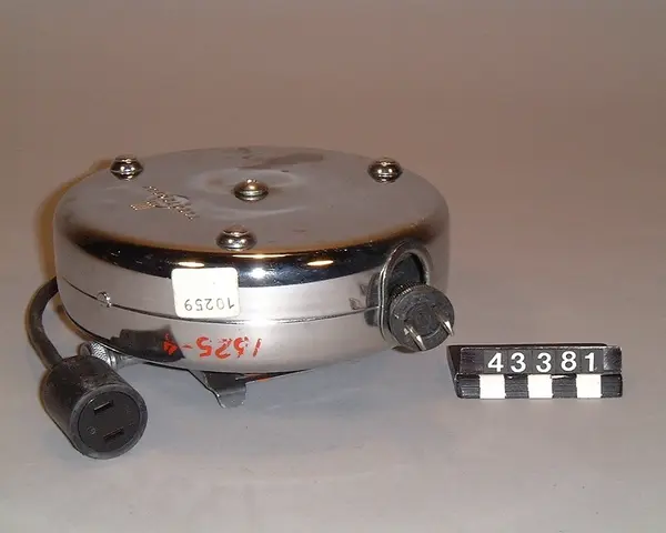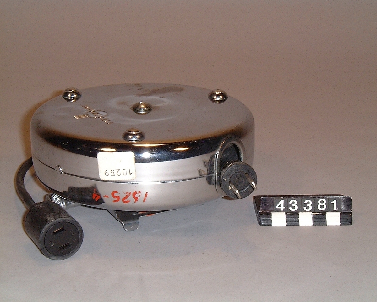 Sladdvinda till dammsugare. Rund flat dosa med tre glidskor på framsidan. Automatiskt pålindande fjäderdriven trumma. Apparatkontakt på baksidan, som har anslutningsbygel för Elux Corp Mod XXX.