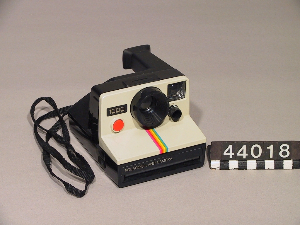 Direktbildskamera Polaroid Land Camera 1000. Kamerahus i vit och svart plast. Optik med fixfokus-lins 103 mm. Bländare f/14.6 och elektronisk slutare 1/150 - 1 sek. Automatisk exponering med exponeringskompensering för ljusare eller mörkare bild. Sockel för anlsutning av blixtlampor. Filmtyp SX-70 packfilm med 10 färgbilder per filmpack i torlek 7.9 x 7.9 cm, hastighet ASA 150. Filmpacken innehöll...