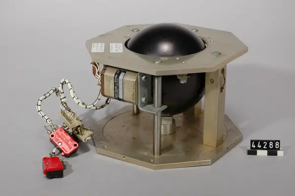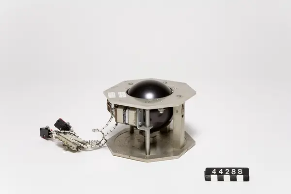 Prototyp till kontrollorgan för radarsystem. Åttakantiga botten- och ovanplattor hopmonterade mellan två distansstolpar. Styrkulan ligger mellan dessa plattor och dess övre del skjuter upp ur ett urtag i den övre plattan. Kulan är vridbar då den vilar mot ett pivotmonterat löphjul av bakelit på bottenplattan och fixeras horisontellt av löphjul av nylon som sitter monterade på distansstolparna. Två pulsräknare som är i förbindelse med styrkulan registrerar dess rörelser i två led. Från pulsräknarna utgår sladdar som är anslutna till två anslutningsplintar och två mikrobrytare. Pulserna omvandlas till en analog signal som styr presentationen på radarskärmen.
