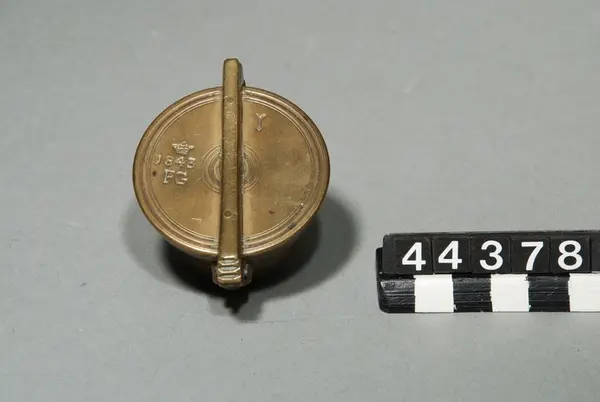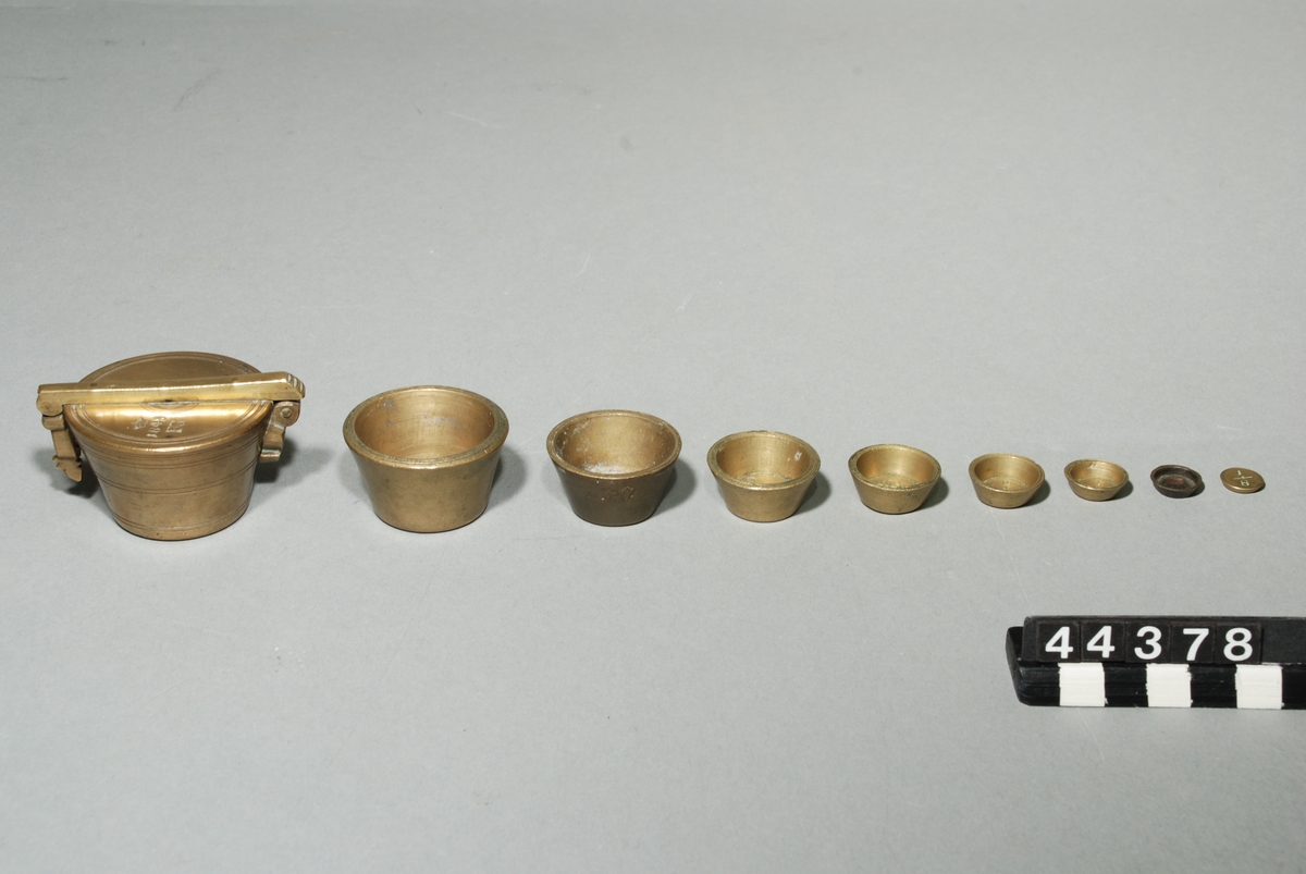 Insatsvikt med en avsmalnande balk och låskläpp på locket En komplett viktsats med 9 st vikter 16 8 4 2 1 ½ ¼ 1/8 Lod Insatsvikt av mässing vikt 1 skålpund, 5 delar 16 8 4 2 1 Lod Tillverkad av FG = Fredrik Gleisman 1826 Gälbgjutarmästare i Stockholm Krönt av FG = Fredrik Gleisman 1826