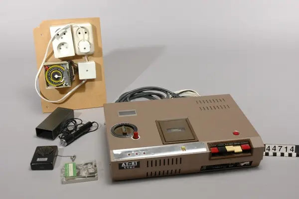 Telefonsvarare Esselte Servifon med kassett och hemmabyggd timerstyrning. Apparaten är förhållandevis stor och tillverkad i hammarlackad plåt. Timerstyrningen tillkom för att begränsa tiden då telefonsvararen var i bruk till veckans arbetsdagar. Telefonsvararen hade också funktion för avlyssning av inspelade meddelanden via telefonnätet. Medföljande bandkassett, mikrofon, dosa för fjärravlyssning ...