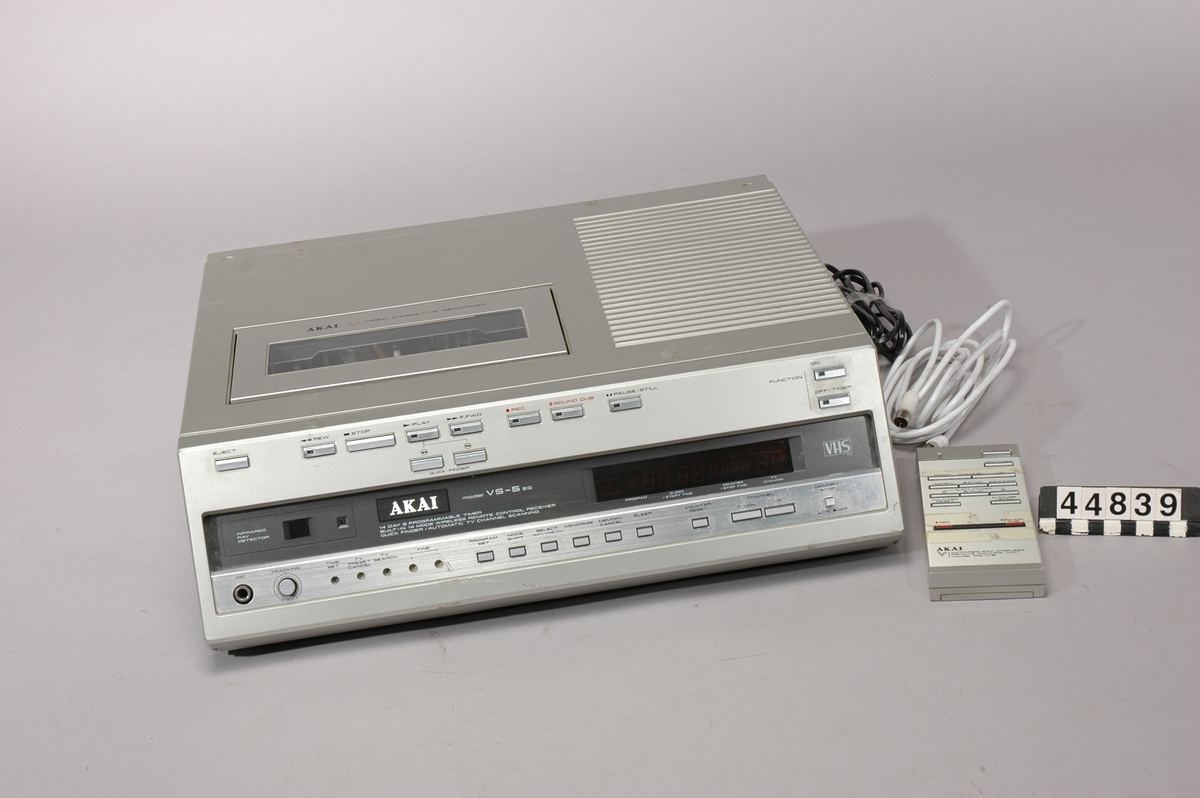 AKAI PAL VHS toppmatad videobandspelare med infraröd fjärrkontroll. Hölje av grå plast, med kontroller och anslutningsmöjlighet för mikrofon på fronten. Anslutning för antenn, apparatsladd samt utgångar för video (RCA) och audio (DIN). Inbyggd tevemottagare/tuner VHF band I - UHF band IV/V. Inbyggt 24h digitalur med fluorescerande display, insomningsfunktion.Timerinställning för inspelning av högst nio program; fem engångs, två varje-dag och två varje-vecka. Fjärrkontroll, bruksanvisning och sladdar medföljer.