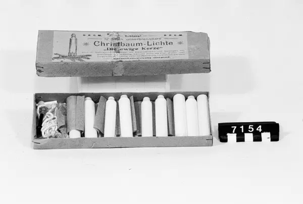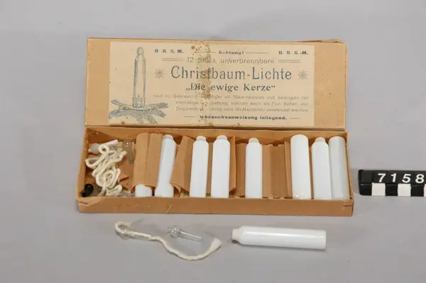 • Givaren uppgav skriftligen följande: "Julgransljus/Die evige Kerze såldes år 1922 av en kringvandrande handelsman. Enligt en beskrivning som från början låg i förpackningen var det meningen att 'ljuset' skulle fyllas med sprit som sedan sögs upp av veken som slutade i det lilla glasröret."
