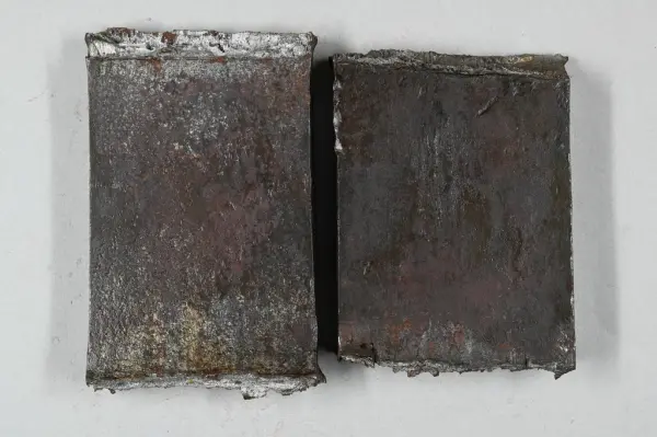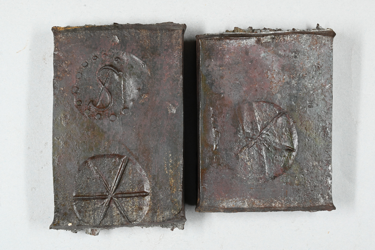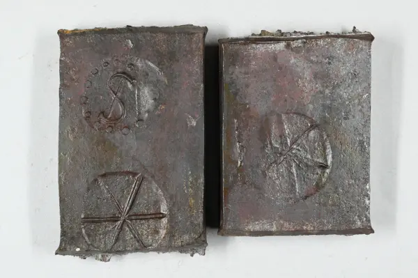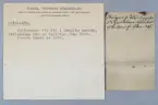 • Två prover på stångjärn. Ett av proverna har två stämplar och det andra provet har enbart en stämpel. Tillhörande lappar med notering: "Stångjern fr. Wij i Ugglebo Sn i Gestrikland tillverkat af tackj... Visa hela