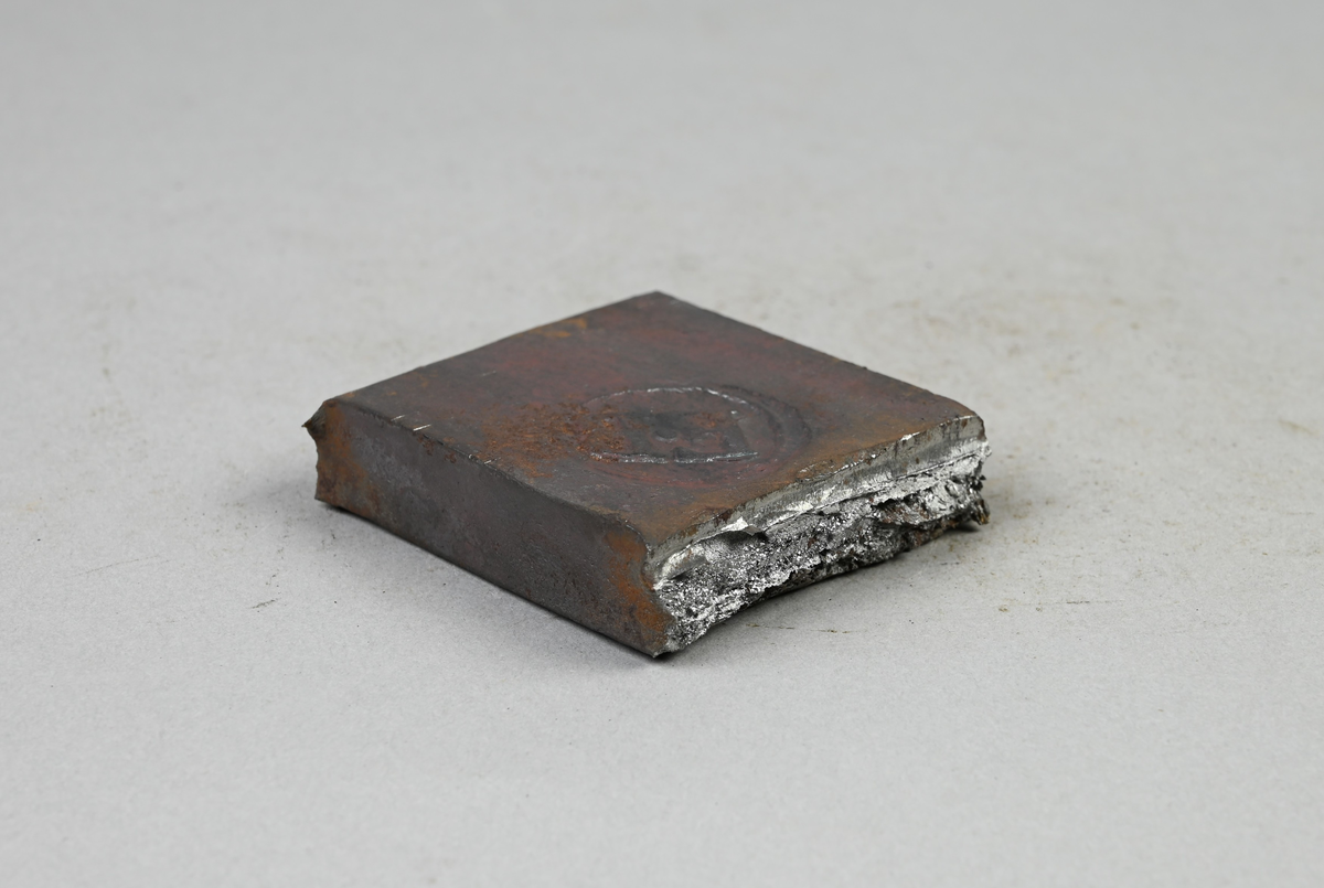 • Prov på stångjärn. Märkning på provet med brukets stämpel. Tillhörande lapp med notering: "Stångjern ifrån Engelsberg i Norbergs bergslag, tillverkadt af tackjern ifrån Lanforsen. Uti härden har man begagnat sig af luft, som varit omkring 100° varm."