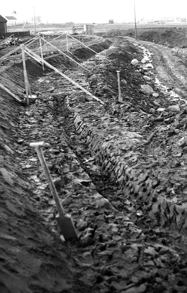 Malfors kraftverk. Vattenväg. Arbete med fördämningen intill tegelbruket, i samband med kraftstationsbygget vid Malfors. I bakgrunden till vänster skymtar hörnet på disponentvillans bod vid Ljungs tegelbruk samt Ljungs kyrka.