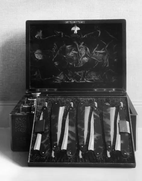 Schebo schatullet, samma föremål med öfversta lådan uttagen och ställd lutande mot schatullet. Innehåll: en stor samling toalettföremål i olika utföranden. Etuiet skänkt till Brukspatron August Michaelsson på 1840-talet av Joseph Rodgers & Sons Sheffield. Föremålen är gjorda av stål, framställt av vallonjärn från Schebo Bruk. Den engelska firman köpte till väsentlig del sitt behov av järn från Schebo. Ägare 1936: Ingenjör Carl Michaelsson. Rakknifvar af degelstål andra lådan uttagen.
