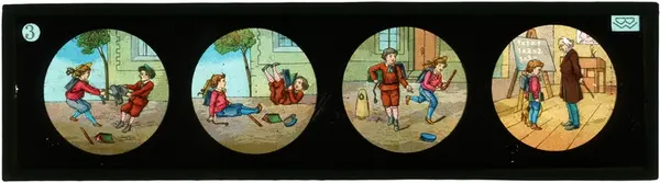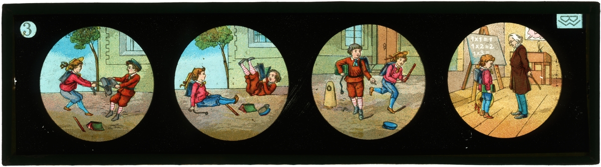 Handmålad bild på glas för skioptikon/laterna magica. Motiv av båkande pojkar som får uppläxning av magistern.