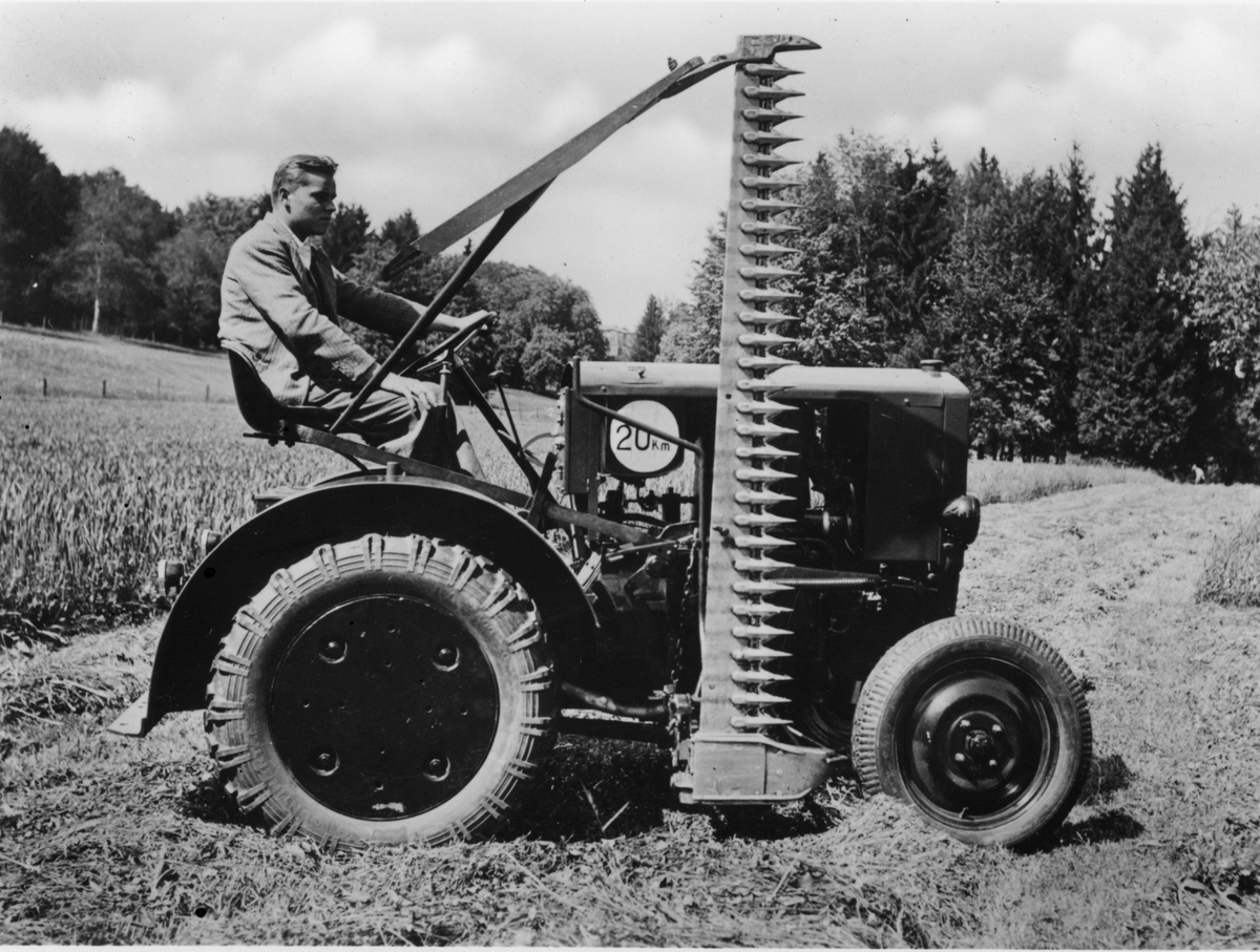 Traktor med slåttermaskin.
