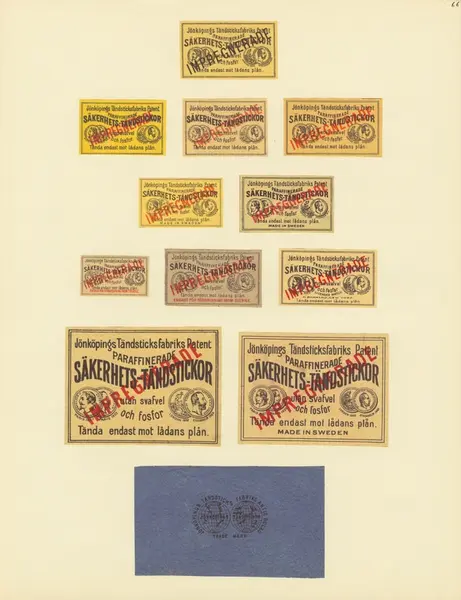 Etiketter för tändsticksaskar, från Svenskt Industri- och Handelsmuseum.(Jönköpings Tändsticksfabrik).