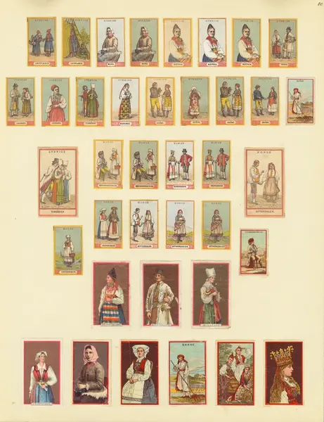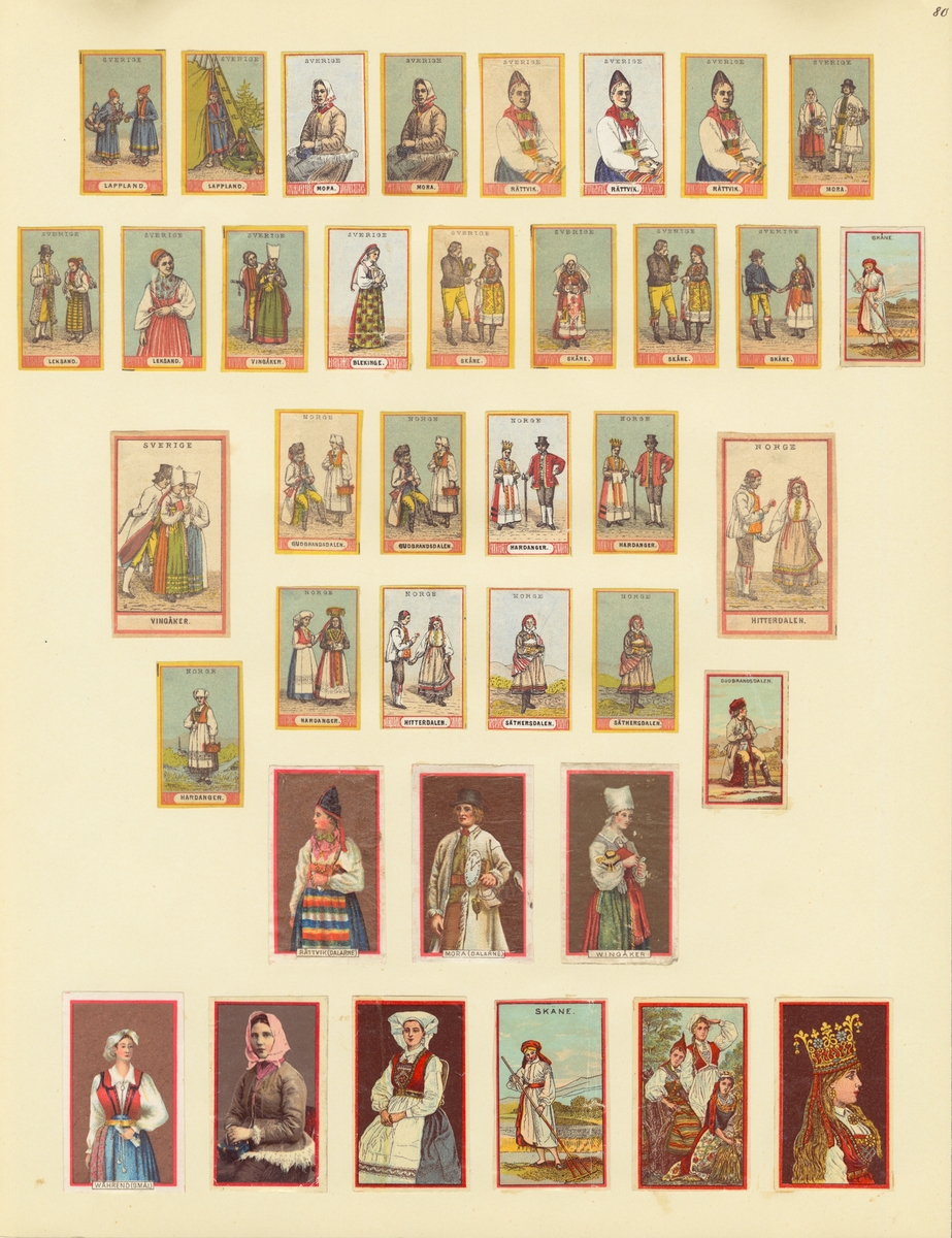 Etiketter för tändsticksaskar, från Svenskt Industri- och Handelsmuseum. (Landskapsdräkter).