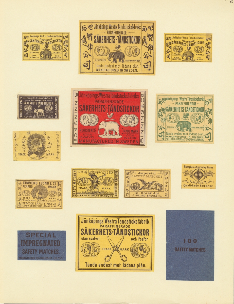 Etiketter för tändsticksaskar, från Svenskt Industri- och Handelsmuseum.(Jönköpings Westra Tändsticksfabrik).