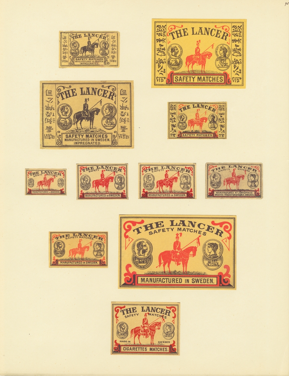 Etiketter för tändsticksaskar, från Svenskt Industri- och Handelsmuseum.(The Lancer).