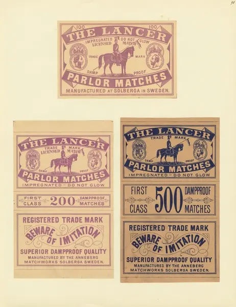Etiketter för tändsticksaskar, från Svenskt Industri- och Handelsmuseum. (The Lancer).