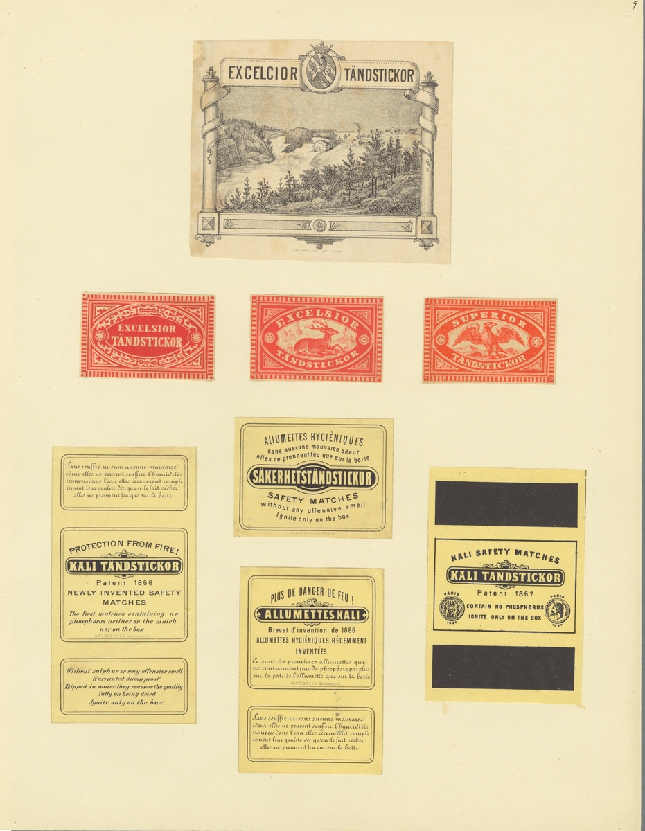 Etiketter för tändsticksaskar, från Svenskt Industri- och Handelsmuseum. (Excelcior Tändstickor, Kali Tändstickor).