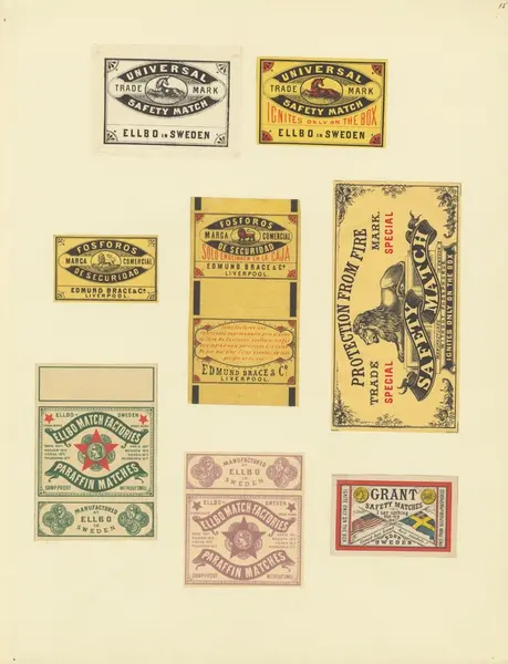 Etiketter för tändsticksaskar, från Svenskt Industri- och Handelsmuseum. (Ellbo tändstickor, Ellbo Tändsticksfabrik).
