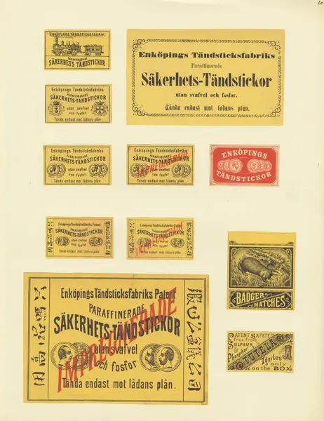 • Etiketter för tändsticksaskar, från Svenskt Industri- och Handelsmuseum.