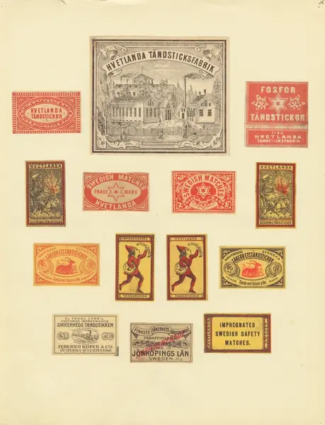 Etiketter för tändsticksaskar, från Svenskt Industri- och Handelsmuseum.(Hvetlanda Tändsticksfabrik).