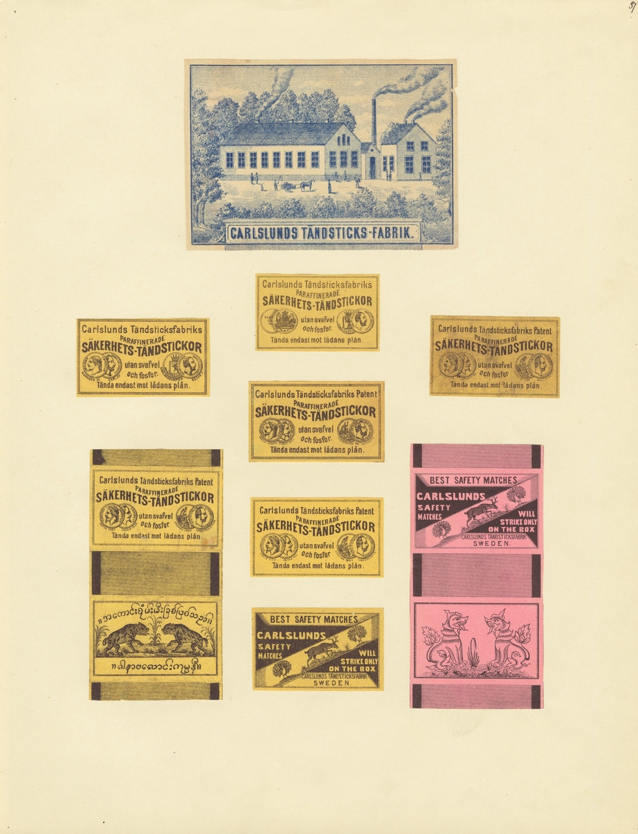 Etiketter för tändsticksaskar, från Svenskt Industri- och Handelsmuseum. (Carlslunds Tändsticksfabrik).