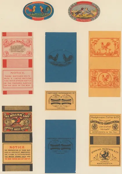 • Etiketter för tändsticksaskar, från Svenskt Industri- och Handelsmuseum.