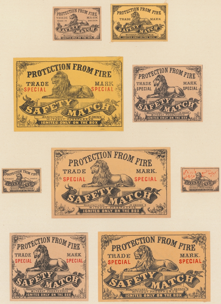 • Etiketter för tändsticksaskar, från Svenskt Industri- och Handelsmuseum.