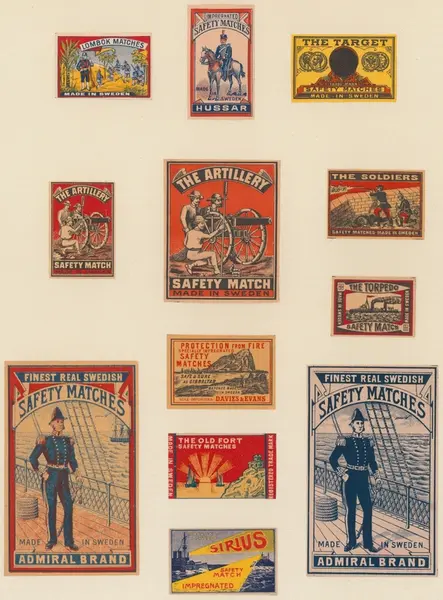 Etiketter för tändsticksaskar, från Svenskt Industri- och Handelsmuseum.Militära motiv.