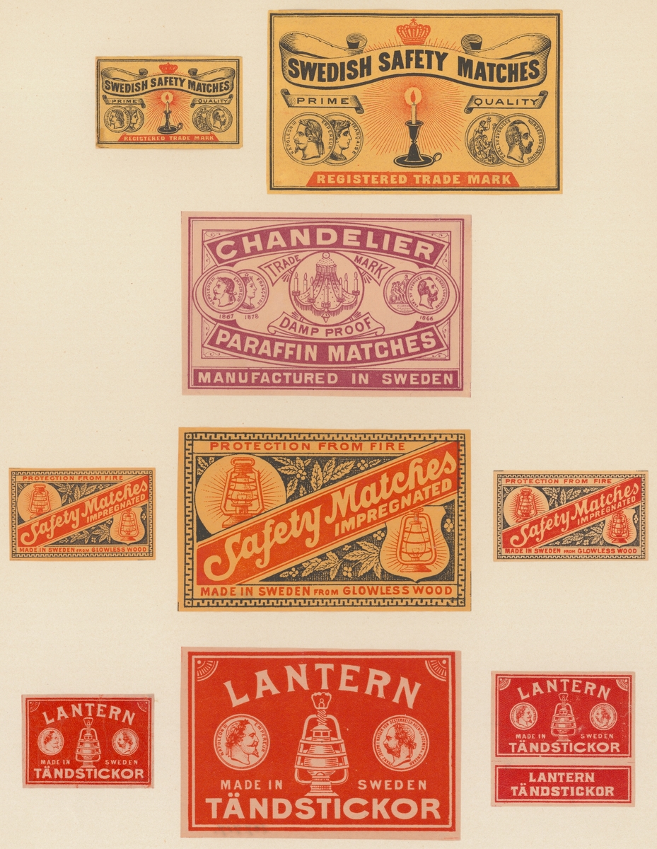 • Etiketter för tändsticksaskar, från Svenskt Industri- och Handelsmuseum.
