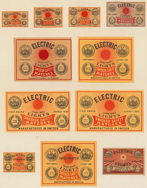 Etiketter för tändsticksaskar, från Svenskt Industri- och Handelsmuseum.Elektricitet.